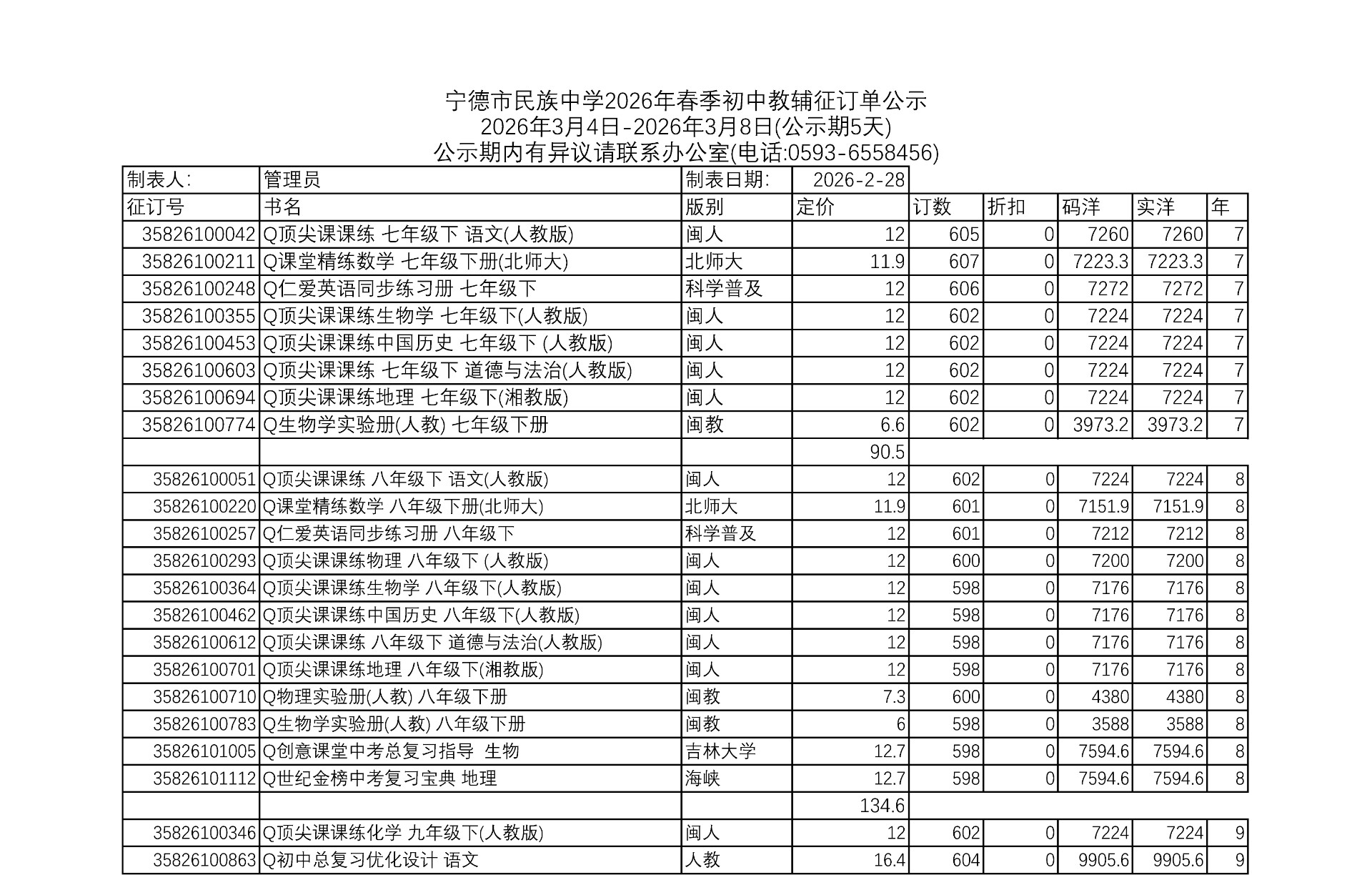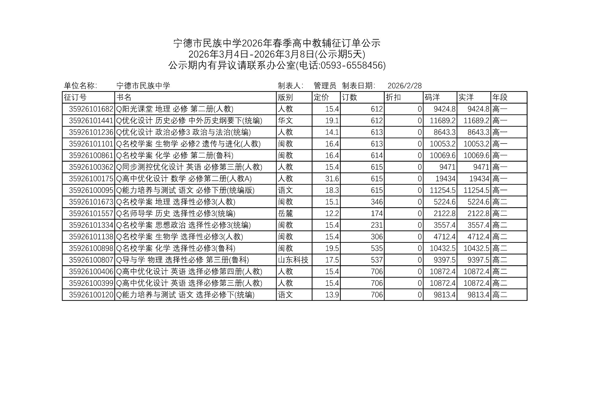 宁德市民族中学2025—2026学年春季初、高中教辅代购公示